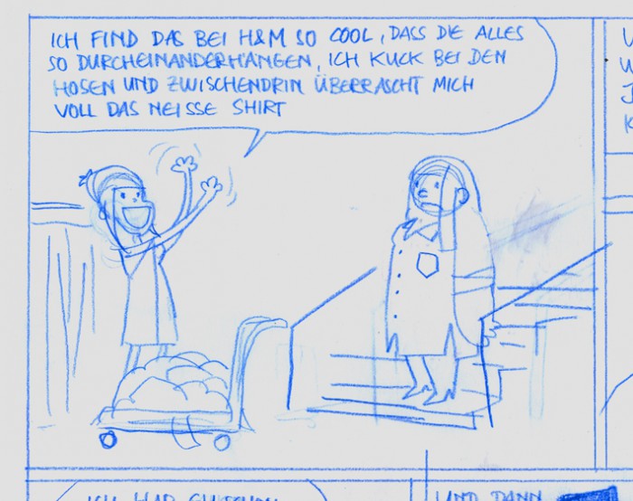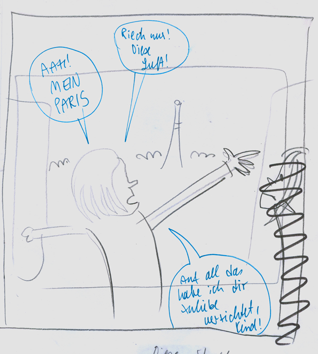 Die finale Bleistiftzeichnung realisierte ich, während mein Sohn und zwei seiner Freunde sich um meinen Zeichentisch herum heftige, sehr lautstarke Laserschwert-Kämpfe lieferten. Dafür ist sie eigentlich ganz gut geworden…