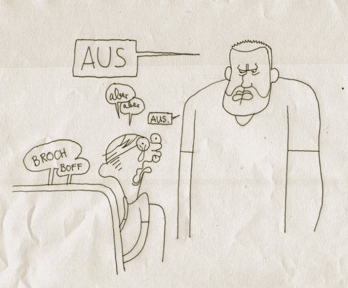 Ausdruck des finalen Covers mit pingeligen Korrektur-Notizen („Komisch!“, „Kleiner Finger!“. „Falte!“, „Kreuzstrich weg!“, etc.). Jetzt haut unser Dorlchen hin: Schlecht gelaunt und trotzdem cool… die Mütze kommt auch gut. Und endlich, ENDLICH funktionieren die Farben! Puha…